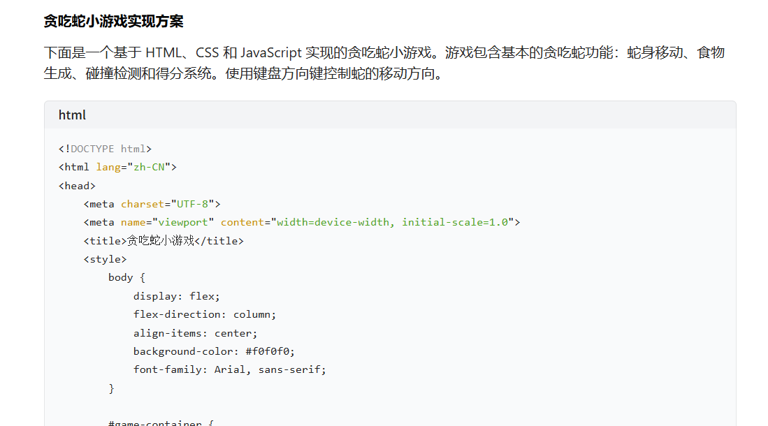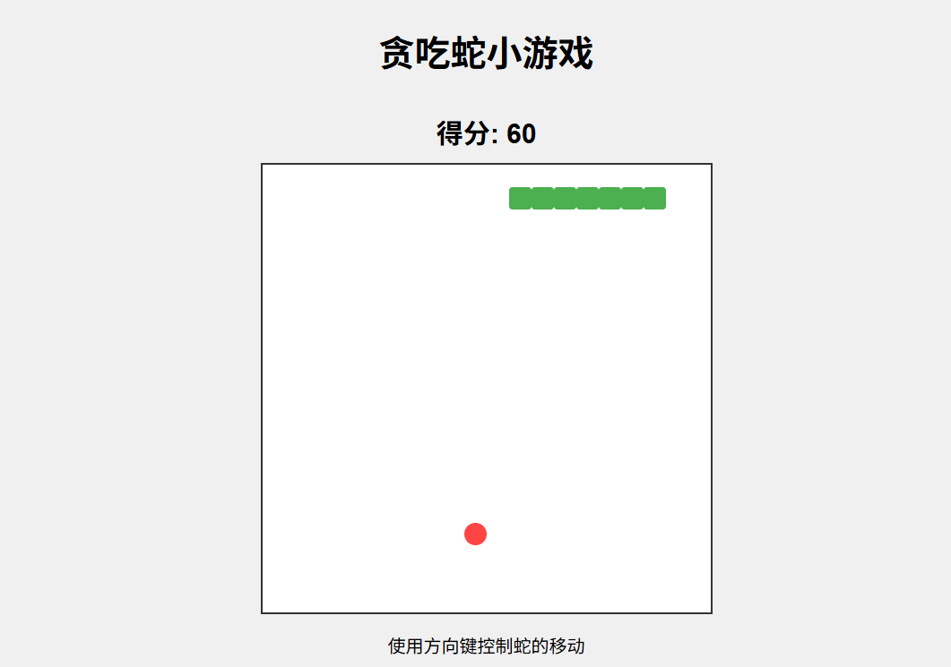 下面是一个基于 HTML、CSS 和 JavaScript 实现的贪吃蛇小游戏。游戏包含基本的贪吃蛇功能:蛇身移动、食物生成、碰撞检测和得分系统。使用键盘方向键控制蛇的移动方向。